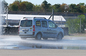 Wasserfontänen spritzen aus dem Boden gegen das Fahrzeug, der Asphalt ist nass und rutschig – keine optimalen Fahrbedingungen. Bei solch riskanten Bedingungen die Kontrolle über das schnelle Fahrzeug zu behalten, richtig zu reagieren und zu bremsen: das waren die Ziele des ADAC-Fahrsicherheitstrainings, das die Fahrer der DMS Schmitt-Gruppe absolvierten.