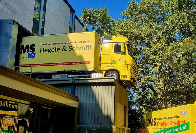 Vorhang auf für Hegele Schmitt. Dieser Anblick dürfte für Theaterbesucher und eingefleischte Umzugsprofis gleichermaßen eine Premiere sein: Ein riesiger, knallgelber Möbeltransporter präsentiert sich auf dem »Balkon« eines Theaters. Fast erinnert das Bild an die Balkonszene aus Shakespeares Drama Romeo und Julia. Nur stand hier keine romantische Geschichte im Vordergrund, sondern ein ganz sachliches Umzugsprojekt.